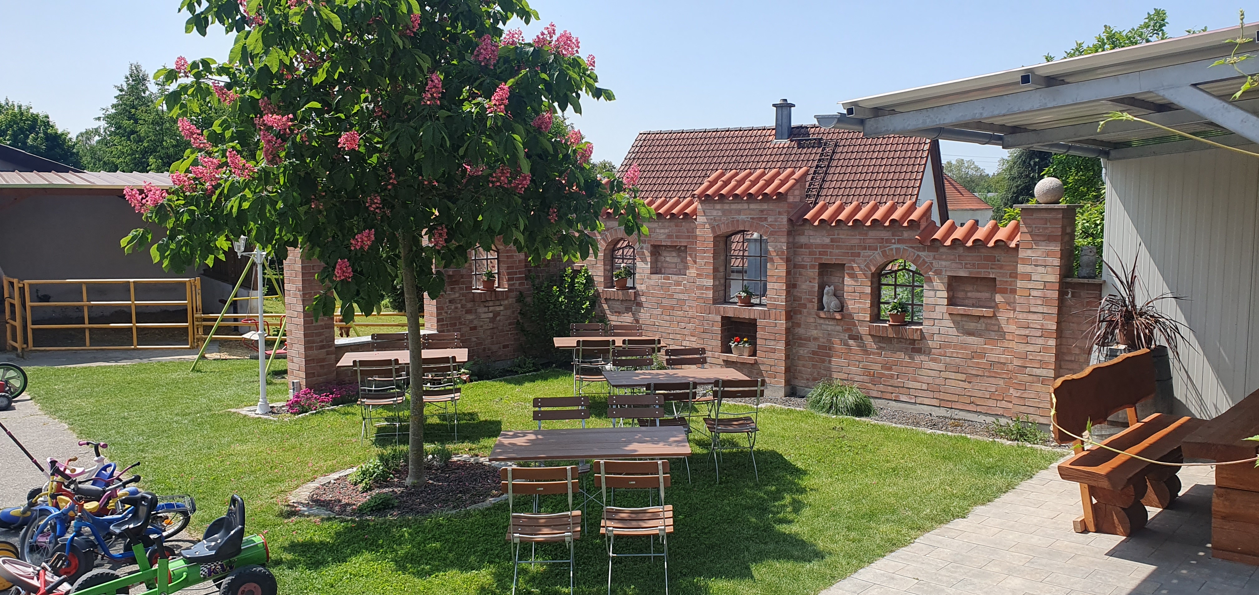 Schon im Jahr 1990 begann unsere Geschichte als Gastgeberfamilie. Ein Teil des damaligen landwirtschaftlichen Betriebs wurde mit viel Eigenarbeit und Herzblut in ein kleines Gästehaus verwandelt. Wo früher Schweine- und Kälberställe standen, entstanden die ersten vier Appartements. Als 2002 die Eröffnung des LEGOLAND Deutschland® bekannt gegeben wurde, stand Georg vor einer wegweisenden Entscheidung: den Hof rein landwirtschaftlich weiterzuführen oder Gästen aus nah und fern ein Zuhause auf Zeit zu bieten. Er entschied sich für den Tourismus – und damit für das, was unseren Hof bis heute ausmacht: persönliche Gastfreundschaft. Der ehemalige Bullenstall wurde vollständig umgebaut und bildet heute das Haupthaus unseres Gästehauses.